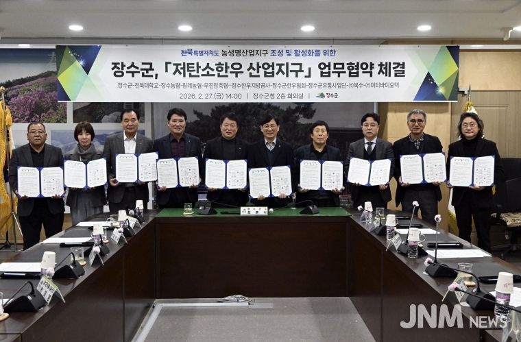 제이앤엠뉴스 | 장수군이 저탄소한우 산업지구의 성공적 조성과 활성화를 위해 10개 기관 및 단체와 업무협약을 맺었다.