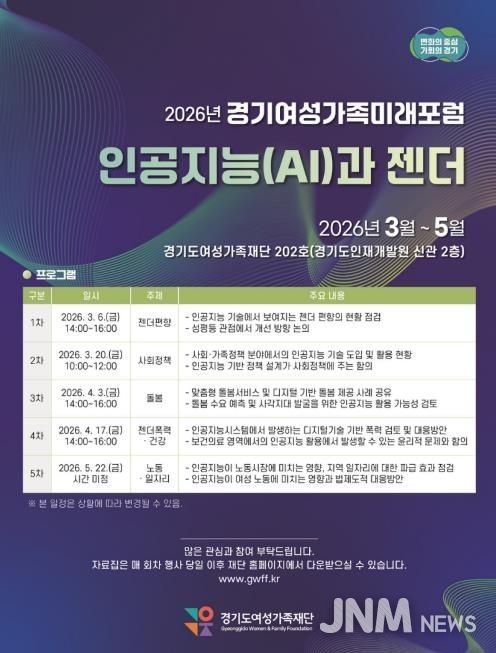 제이앤엠뉴스 | 경기도여성가족재단이 인공지능과 젠더 이슈를 다루는 미래포럼을 5월까지 총 5회에 걸쳐 개최한다.