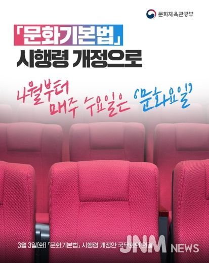 제이앤엠뉴스 | 문화체육관광부가 3월 3일 국무회의에서 「문화기본법」 시행령 개정안을 통과시킴에 따라, 4월부터 매주 수요일이 '문화요일'로 지정된다.