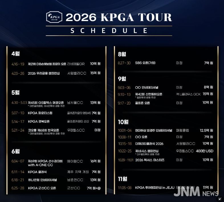 제이앤엠뉴스 | 한국프로골프투어(KPGT)는 2026년 KPGA 투어 일정을 확정하고, 총 20개 대회와 244억 원이 넘는 총상금 규모를 발표했다.