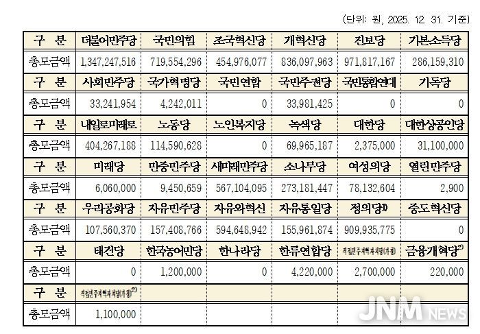 제이앤엠뉴스 | 중앙선거관리위원회가 2025년도 중앙당후원회와 국회의원후원회에서 모금된 후원금 내역을 공개했다.