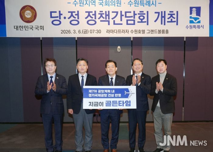 제이앤엠뉴스 | 이재준 수원특례시장은 6일 라마다프라자 수원호텔에서 열린 지역 국회의원들과 당·정 정책간담회에서 “제7차 공항개발 종합계획에 ‘경기국제공항’ 건설 내용이 반영될 수 있도록, 경기도와 협의해 달라”고 요청했다.