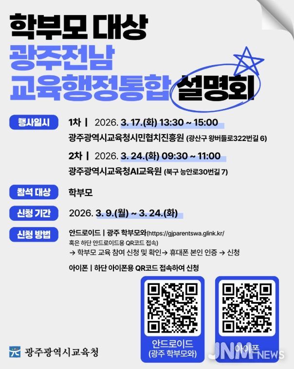 제이앤엠뉴스 | 광주광역시교육청이 학부모들의 교육행정통합 관련 궁금증을 해소하기 위해 설명회를 두 차례 마련한다.