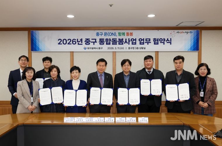제이앤엠뉴스 | 대구 중구는 지난 11일 구청 상황실에서 지역 내 7개 기관과 함께 ‘중구 온(ON) 함께 돌봄’ 통합돌봄 지역특화사업의 원활한 운영을 위한 업무협약을 맺었다.