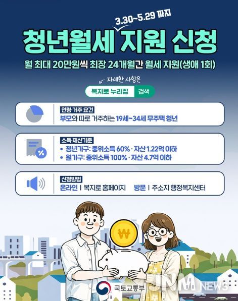 제이앤엠뉴스 | 국토교통부가 청년을 대상으로 월세 지원 신청을 3월 30일부터 5월 29일까지 받는다.