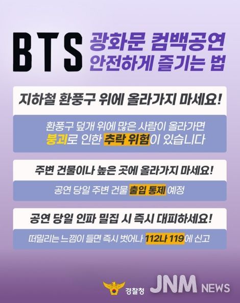 제이앤엠뉴스 | BTS의 광화문 컴백공연을 앞두고 경찰청이 관람객 안전수칙을 안내했다.