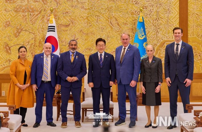 제이앤엠뉴스 | 이재명 대통령이 3월 31일 청와대에서 미국 의회 코리아스터디그룹 대표단과 만나 한미 관계와 한반도 현안, 최근 중동 지역의 전쟁 상황 등에 대해 논의했다.