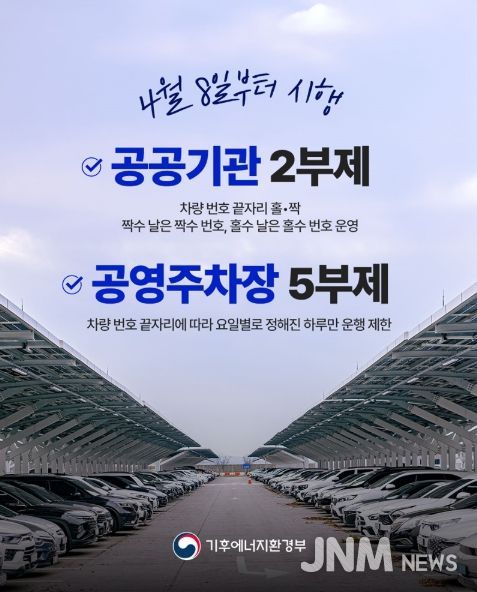 제이앤엠뉴스 | 기후에너지환경부는 4월 8일부터 공공기관 차량 2부제와 공영주차장 5부제를 도입한다.