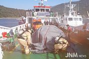 제이앤엠뉴스 | 남해지방해양경찰청은 29일 오전 경남 하동 노량항 인근 해상에서 차도선 내 전기차 화재 사고 대비, 관계기관 합동 수난대비기본훈련을 실시했다고 밝혔다. 최근 전기차ㆍ리튬이온배터리 등 2차 전지 기인 화재 위험성에 대한 사회적 관심이 높은 가운데, 남해청 관내 전기차를 운송하는 차도선 및 여객선 29척에 대한 사전 예방 활동과 사고 발생 시 현장 대응 역량 강화 또한 요구되고 있는 실정이다. 이에 남해지방해양경찰청은 운항 중인 차도선 내 전기차에서 화재가 발생한 상황을 가정하여 승객 탈출 및 인명구조 활동은 물론, 하부관창과 질식소화덮개 등 전용 장비를 활용한 초기 화재 진압, 긴급 피항 이후 소방과 연계된 완전 진화 활동까지 실전 중심의 현장 기동훈련을 진행했다. 이날 훈련에는 하동군청, 남해군청, 해양환경관리공단, 소방 등 7개 유관기관 및 해양재난구조대(드론수색대)가 함께 했으며, 총 8척의 함선과 드론 1기, 차량 2대가 동원됐다. 뿐만 아니라, 이날 훈련에 참가한 유관기관 및 해양재난구조대 등을 대상으로 실제 전기차 배터리 셀에 화재 상황을 연출하고 전용 장비를 사용한 화재