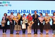 제이앤엠뉴스 | 전라남도 나주시는 지난 7일 나주문화예술회관에서 나주시 어린이집 보육 교직원 550여 명이 참석한 가운데 ‘어린이집 보육 교직원 한마음대회’를 개최했다. 나주시어린이집연합회 주관으로 열린 이번 행사는 보육 교직원 윤리 강령 선서, 보육 교직원 유공 표창장 시상, 재즈 색소폰 및 댄스 크루 공연 등으로 구성되어 보육 교직원들의 사기를 높이는 의미 있는 행사로 꾸며졌다. 나주시어린이집연합회 김귀순 회장은 “오늘 한마음대회가 보육 교직원들의 화합과 단결을 도모하는 계기가 되었으면 한다”며 “앞으로도 이런 행사를 통해 직무스트레스를 완화하고 더욱 발전해 나가는 나주시어린이집연합회가 되기 위하여 노력하겠다”고 말했다 윤병태 나주시장은 “나주시 아이들을 위해 보육 현장에서 묵묵히 근무하시는 모든 보육 교직원분의 노고를 격려하는 자리에 함께해서 기쁘다”며 “항상 우리 아이들이 건강하고 행복하게 자랄 수 있도록 힘써주시는 보육 교직원분들께 감사드린다”고 밝혔다. [뉴스출처 : 전라남도 나주시]