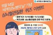 제이앤엠뉴스 | 서귀포시 동부보건소는 2025년 ‘세계 당뇨병의 날’을 기념하여 11월 10일부터 11월 23일까지 14일간 모바일 앱 ‘워크온’을 활용한 심뇌혈관질환 퀴즈 이벤트를 운영한다. 이번 퀴즈 이벤트는 지역 주민들에게 고혈압, 당뇨병 등 선행질환을 포함한 심뇌혈관질환에 대한 올바른 정보제공과 건강생활실천 습관을 독려하기 위해 마련됐으며, 서귀포시 동부 지역 주민이라면 모바일 걷기 앱인 ‘워크온(WalkOn)’을 통해 쉽게 참여할 수 있다. 참여 방법은 ‘워크온(WalkOn)’ 앱 내 서귀포시 동부보건소 ‘하영걸을락’ 커뮤니티에 가입한 후, 심뇌혈관질환 퀴즈 5문제를 다 풀고 응모하기 버튼을 누르면 된다. 퀴즈 참여 정답자 중 추첨을 통해서 100명에게는 소정의 기념품도 제공된다. 서귀포시 동부보건소 관계자는 “이번 이벤트로 지역 주민들이 자기 혈관 수치에 관심을 갖고, 스스로 건강관리 계기를 마련했으면 좋겠다”라고 말하며, “많은 사람들이 참여하여 심뇌혈관질환 예방 실천의 중요성을 알고, 더 나아가 주변에 알릴 수 있기를 바란다”라고 했다. [뉴스출처 : 제주도 서귀포시]