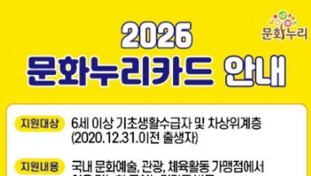 제이앤엠뉴스 | 정부 정책에 따라 2026년부터 통합문화이용권(문화누리카드)과 청년문화예술패스 제도가 개편된다. 이에 따라 양주시는 개편 기준에 맞춰 지역대상자를 대상으로 해당 사업을 확대 시행한다고 밝혔다. 통합문화이용권(문화누리카드)은 6세 이상 기초생활수급자와 차상위계층을 대상으로 문화·여행·체육 활동을 지원하는 사업으로, 2026년에는 지원 인원이 16,386명으로 전년 대비 1,687명 증가한다. 또한 1인당 지원 금액도 기존 14만 원에서 15만 원으로 1만 원 인상된다. 특히 청소년(13~18세)과 생애전환기(60~64세) 대상자는 1만 원이 추가 지원돼 총 16만 원을 지원받게 된다. 청년층의 문화 향유 기회를 넓히기 위한 청년문화예술패스도 지원 대상이 확대된다. 2026년 지원 인원은 1,645명으로 전년 대비 727명 증가하며, 지원 연령 역시 기존 19세에서 19~20세로 확대된다. 통합문화이용권(문화누리카드)은 2월 2일부터 누리집 또는 각 읍면동 행정복지센터를 방문해 신청 가능하며, 자세한 사항은 문화누리카드 고객지원센터로 문의하면 된다. 청년문화예술패스는 2월