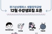 제이앤엠뉴스 | 경기문화재단 경기상상캠퍼스(대표이사 유정주)는 겨울 시즌 생활창작공방 프로그램 참여자를 오는 17일부터 모집한다. 생활창작공방은 경기상상캠퍼스 생생1990에 위치한 경기생활문화센터 교육 커뮤니티 공간으로, 도민이 일상 속에서 다양한 창작 활동을 경험할 수 있도록 재단공방, 어린이창작공방, 드로잉실, 취미공방, 직물공방, 커피공방, 사진촬영실까지 총 7개의 특화 공간을 운영하고 있다. 11월에는 총 11개의 프로그램이 구성돼 있으며, 주요 프로그램으로는 △Set in wool(울조끼와 가방 만들기), △오롯이 나에게 집중하는 시간: 4주 터프팅 힐링 프로젝트, △내 생애 첫 그림- 알기 쉬운 민화'일월오봉도', △그림책 마음 놀이터 등이 있다. 12월에는 △오일파스텔로 만드는 2026년 달력 △우리들의 예술놀이터, △복을 담는 라탄 복조리 만들기, △복을 쓸어 담는 모시 빗자루 만들기, △커피의 감별과 추출 방법: 커핑까지 총 5개의 프로그램이 운영될 예정이며, 수강 신청은 11월 14일부터 각 프로그램 시작 4일 전까지 경기상상캠퍼스 누리집을 통해 가능하다. 경기상상캠퍼스 내 생활창