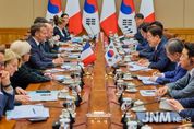 제이앤엠뉴스 | 이재명 대통령과 에마뉘엘 마크롱 프랑스 대통령이 청와대에서 정상회담을 열고, 수교 140주년을 맞은 양국 관계의 전략적 동반자 격상 및 다양한 분야의 협력 확대 방안을 논의했다. 양국 정상은 올해 한-프랑스 수교 140주년을 계기로 마크롱 대통령의 첫 방한을 환영하며, 프랑스 대통령으로서는 11년 만의 방문임을 의미 있게 평가했다. 이재명 대통령은 마크롱 대통령이 신정부 출범 이후 처음으로 방한한 유럽 정상임을 강조했다. 마크롱 대통령은 이번 방문이 뜻깊다고 밝혔다. 이번 회담에서 양측은 국방·안보, 경제, 첨단기술, 문화, 인적교류 등 다양한 분야에서의 협력 강화 방안을 집중적으로 논의했다. 국방 분야에서는 프랑스의 인태지역 합동훈련에 한국이 참여하는 등 지속적인 협력 의지를 확인했다. 이재명 대통령은 6·25 전쟁 당시 프랑스의 파병을 언급하며, '보훈협력 MOU' 체결로 참전용사의 공로를 기릴 뜻을 밝혔다. 경제 및 무역 부문에서는 양국 간 교역이 지난해 150억 불로 사상 최고치를 기록했으나, 경제 규모와 상호 보완성을 고려할 때 추가 성장 가능성에 공감했다. 양국은 2030년까지 연간 교역 200억 불 달성을 목표로 기업 간 협력과
