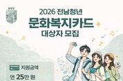 제이앤엠뉴스 | 담양군은 관내 청년을 대상으로 문화생활 향유 및 자기 계발 기회를 제공하고자 전남청년 문화복지카드 지원사업을 추진한다고 9일 밝혔다. 주소지 읍·면 사무소 방문 신청은 2월 9일부터 3월 31일까지, 농협카드 누리집 신청은 2월 20일부터 3월 31일까지 가능하며 기존 수혜자도 반드시 다시 신청해야 한다. 다만 공공기관 근무자, 학교 밖 청소년 수당 대상자, 여성농업인 행복바우처 대상자는 제외되며, 문화누리카드 수혜자는 중복 지원을 받을 수 있다. 2024년 2월 9일 이전부터 도내 거주한 19~28세 청년을 대상으로 하며, 연 25만 원의 문화복지비가 지원된다. 지원금은 문화·공연 관람, 학원 수강, 도서 구입 등 문화·여가 및 자기 계발 분야에서 사용할 수 있으며, 전남 도내에서 올해 안에 모두 사용해야 한다. 군 관계자는 “전남청년 문화복지카드 지원사업을 통해 청년들의 문화 참여 기회를 넓히고 삶의 질을 높이는 계기가 되길 바란다”라며 “앞으로도 청년의 수요를 반영한 문화·복지 정책을 추진해 청년이 머물고 성장할 수 있는 담양을 만들어 가겠다”라고 말했다. [뉴
