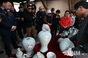 제이앤엠뉴스 | 1300˚C를 견딘 청자의 빛은 영롱하기만 하다. ‘흙과 불 그리고 사람의 이야기’를 주제로 열리고 있는 제54회 강진청자축제. 지난 22일 강진군 대구면 고려청자박물관 제2호가마에서 화목가마 요출행사가 열린 가운데 옛 전통방식 그대로 소나무 장작을 이용해 48시간 동안 구워낸 청자를 꺼내고 있다. [뉴스출처 : 전라남도강진군]
